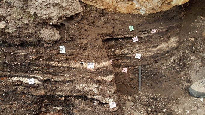 This photo of the stratigraphy shows alternating black (charcoal) and white (ash) layers, that accumulated 60,000 years ago as Neanderthals repeatedly made campfires in the same spot.